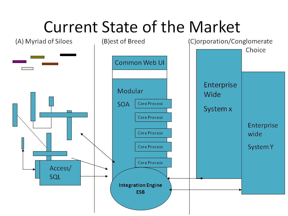 As these limitations and advantages of integrating “best of breed” solutions via state B have become apparent in healthcare, a better understanding informed by lessons from elsewhere in the software industry is also emerging. One might label that “Best of Breed 2.0” or it is now more widely known as Service Oriented Architecture, i.e. a move to align the core services of the organisation with a related modular architecture , towards a more “plug and play” approach. In this regard we’re also seeing a general shift in industry towards “Software as a Service”, where suppliers compete on the service they provide, not the technology they lock you into.